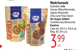Nutrisnack Granola. Lite Cacao Nibs/Almonds, Apple Almonds Chia and Flax Seed No Sugar Added Cranberries/Almonds Exotica Caja de 10.5 a 10.6 oz.