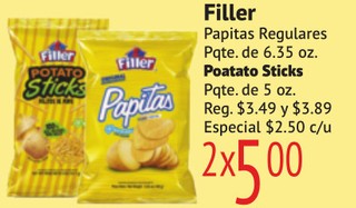 Filler Papitas Regulares Pqte. de 6.35 oz. Poatato Sticks Pqte. de 5 oz.