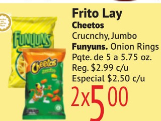 Frito Lay Cheetos Crucnchy, Jumbo Funyuns. Onion Rings Pqte. de 5 a 5.75 oz.