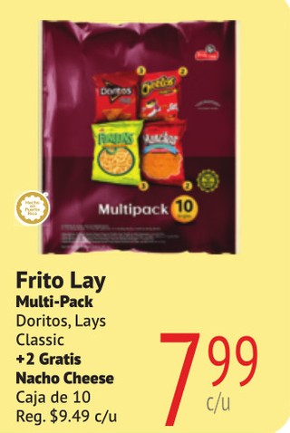 Frito Lay Multi-Pack Doritos, Lays Classic +2 Gratis Nacho Cheese Caja de 10
