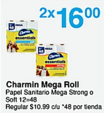 essentials xopma charmin mega roll papel sanitario strong soft =regular $c/u *por tienda