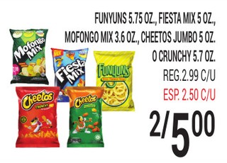 FUNYUNS 5.75 OZ., FIESTA MIX 5OZ, MOFONGO MIX 3.6 OZ., CHEETOS JUMBO 5 OZ. O CRUNCHY 5.7 OZ.