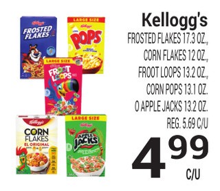 Kellogg's FROSTED FLAKES 17.3 OZ, CORN FLAKES 12 OZ, FROOT LOOPS 13.2 OZ., CORN POPS 13.1 OZ. O APPLE JACKS 13.2 OZ