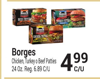 Borges chicken, turkey o beef patties 24 oz.
