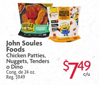 John Soules Foods Chicken Patties, Nuggets, Tenders o Dino Cong. de 24 oz.
