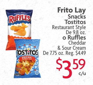 Frito lay snacks Tostitos Restaurant Style De 9.8 oz. o Ruffles Cheddar & Sour Cream De 7.75 oz.