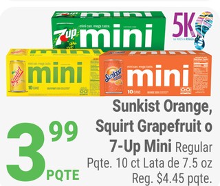 Sunkist Orange, Squirt Grapefruit o 7-Up Mini Regular Pqte. 10 ct. Lata de 7.5 oz