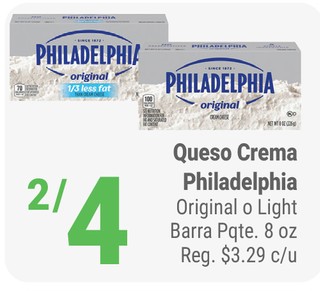 Queso Crema Philadelphia Original o Light Barra Pqte. 8 oz