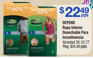 DEPEND Ropa Interior Desechables Para Incontinencia variedad 26-32 CT