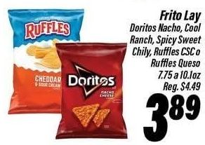 frito ruffles doritos nacho cool cheddar soor cream macho ranch, spicy sweet chily, queso