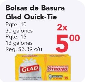 bolsas basura glad quick-tie pqte alones pqte. reg. $c/u strong