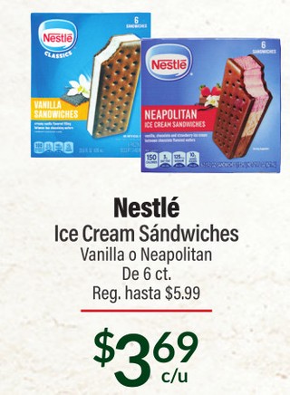 Nestlé Ice Cream Sándwiches Vanilla o Neapolitan De 6 ct.