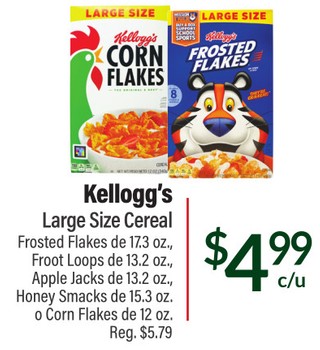 Kellogg's Large Size Cereal Frosted Flakes de 17.oz., Froot Loops de 13.2., Apple Jacks de 13.2 oz., Honey Smacks de 15.3 oz., o Corn Flakes de 12oz.