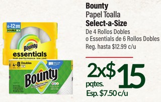 Bounty Papel Toalla Select-a-Size De 4 Rollos Dobles o Essentials de 6 Rollos Dobles