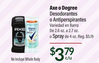 Axe o Degree Desodorantes a Antiperspirantes Variedad en Barra De 2.6 oz. a 2.7 oz. o Spray de 4 oz.