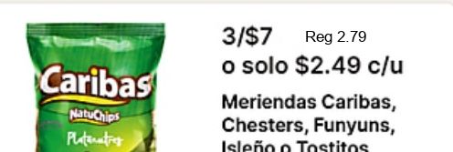 /$reg $c/u caribas meriendas natuchips chesters, funyuns, plateatres isleƱo tostitos