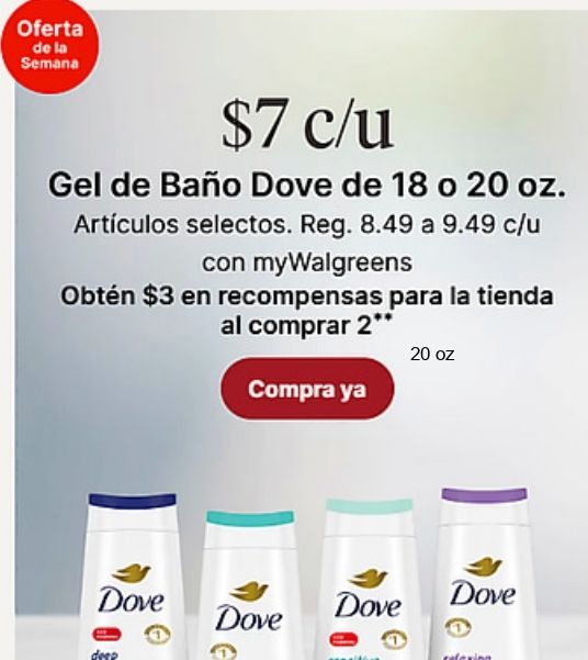 semana $c/u baño dove artículos selectos. reg. mywalgreens obtén recompensas tienda comprar compra desp