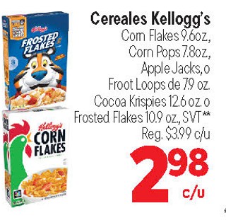 Cereales Kellogg's Com Flakes 9.6oz, Corn Pops 7.8oz, o Apple Jacks, Froot Loops de 7.9 oz. Cocoa Krispies 12.6 oz. o Frosted Flakes 10.9 oz, SVT**
