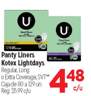 Panty Liners Kotex Lightdays 80 Regular, Long o Extra Coverage, SVT** Caja de 80 a 129 un