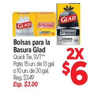 Bolsas para la Basura Glad Quick Tie, SVT** Pqte. 15 un. de 13 13 gal. o 10 un. de 30 gal.