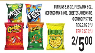 Funyuns 5.75 oz, fiesta mix 5oz., mofongo mix 3.6oz., cheetos jumbo 5 oz. o crunchy 5.7 oz.