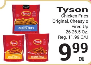 Tyson chicken fries original, cheesy o fired up 26-26.5 oz.