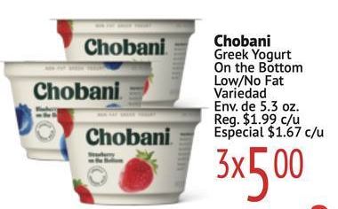 chobani greek yogurt bottom low/no variedad reg. $c/u especial