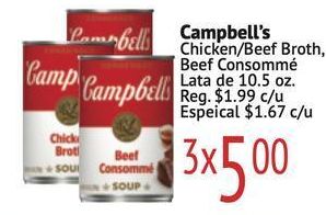 lambell campbell's chicken/beef broth beef consommé lata camp campbell reg. espeical $c/u chick brot soup