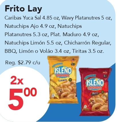 frito caribas yuca wavy platanutres natuchips plat maduro limón chicharrón regular, bbq, voláo tiritas reg. $c/u isleno