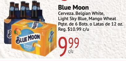 blue moon cerveza belgian white light blue, mango wheat pqte. bots. latas reg. $c/u