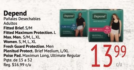 depend paƱales desechables adultos fitted brief maximum protection. max. men. women. fresh guard plenitud protect. medium, l/xl poise pad. maximun long, ultimate regular pqte. reg. $c/u