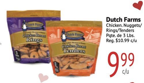 chicken breast rings tenders dutch farms nuggets/ rings/tenders pqte. reg. $c/u