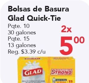 bolsas basura glad quick-tie pqte alones pqte. reg. $c/u strong