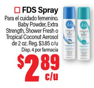 FDS Spray para el cuidado femenino Baby Power, Extra Strengh, Shower Fresh o Tropical Coconut Aerosol de 2 oz .