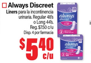 Always Discreet Liners para las incotinencia urinaria , Regular 48's o Long 44's.