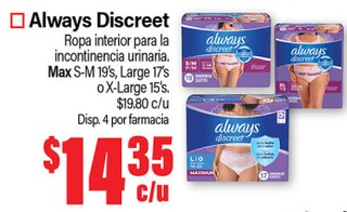 Always Discreet Ropa Interior para la incontinecia urinaria . Max S-M 19's ,Large 15's.