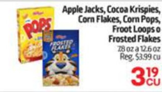 Apple jacks, cocoa krispies, corn flakes, corn pops, froot loops o frosted flakes 7.8 oz a 12.6 oz.