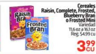 Cereales raisin, complete, frosted, blueberry bran o frosted mini variedad 11.6 oz. a 16.1 oz.