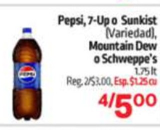 Pepsi, 7-Up o Sunkist (Variedad), Mountain Dew o Schweppe's 1.75lt. Reg. 2/3.00