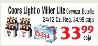 Coors light o miller lite cerveza botella 24/12 oz.