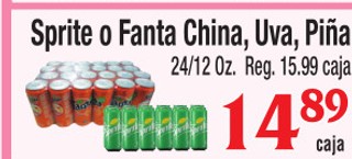 Sprite o fanta china, uva, piña 24/12 oz.