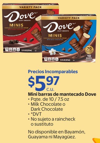 Mini barras de mantecado Dove Pqte. de 10 / 7.5 oz. Milk Chocolate o Dark Chocolate