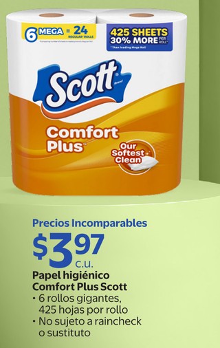 Papel higiénico Comfort Plus Scott 6 rollos gigantes, 425 hojas por rollo No sujeto a raincheck o sustituto
