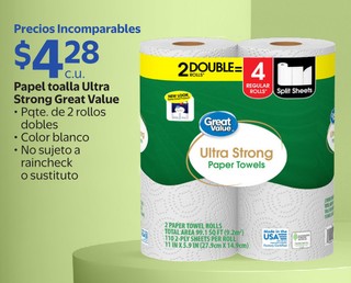 Papel toalla Ultra Strong Great Value Pqte. de 2 rollos dobles Color blanco No sujeto a raincheck o sustituto