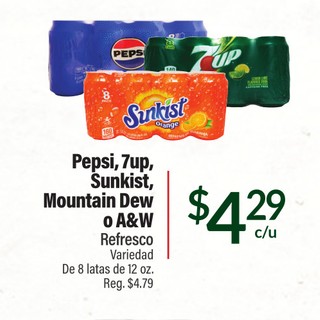 Pepsi, 7up, Sunkist, Mountain Dew o A&W Refresco Variedad De 8 latas de 12 oz.