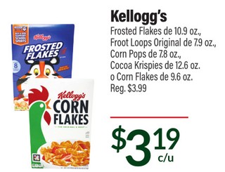 Kellogg's Frosted Flakes de 10.9 oz., Froot Loops Original de 7.9 oz., Corn Pops de 7.8 oz., Cocoa Krispies de 12.6 oz. o Corn Flakes de 9.6 oz.