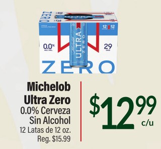 Michelob ultra zero 0.0% cerveza sin alcohol 12 latas de 12 oz.