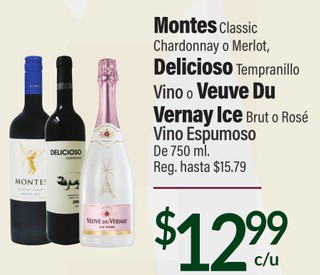 Montes Classic Chardonnay o Merlot, Delicioso Tempranillo Vino o Veuve Du Vernay Ice Brut o Rosé Vino Espumoso De 750 ml.