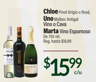 Chloe Pinot Grigio o Rosé, Uno Malbec Antigal Vino o Cava Marta Vino Espumoso De 750 ml.
