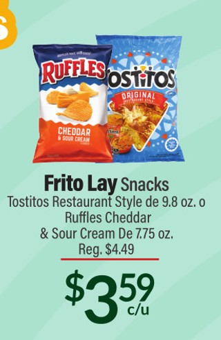 Frito Lay Snacks Tostitos Restaurant Style de 9.8 oz. o Ruffles Cheddar & Sour Cream De 7.75 oz.